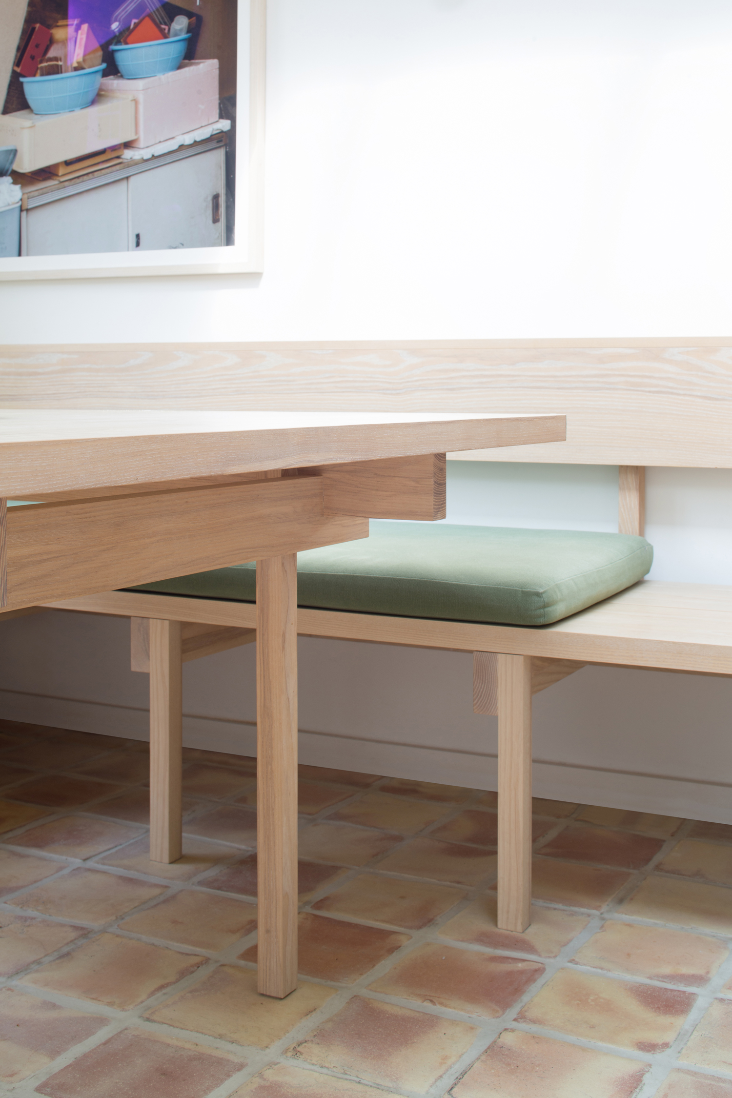 project’s client Sophie Caulfeild. The L-shaped bench wraps a square timber