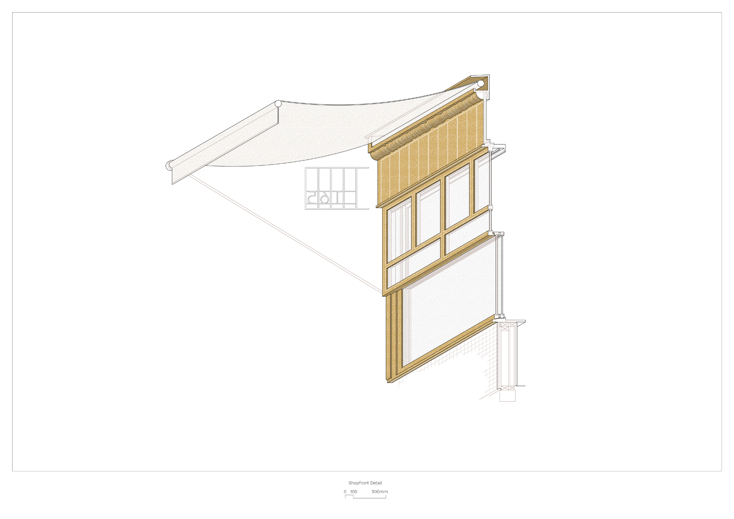 These screens are doubled with conventional glazed sashes that can be raised in part for ventilation, or more fully to create ‘kiosk-like’ openings capable of serving visitors to the weekend market. In addition to the centrally placed door and high-level vents, the family of dynamic components is completed by a hand-cranked awning, forming a three metre extension to the shop’s threshold and allowing a social domestic life to spill onto the pavement for meals or morning coffee.